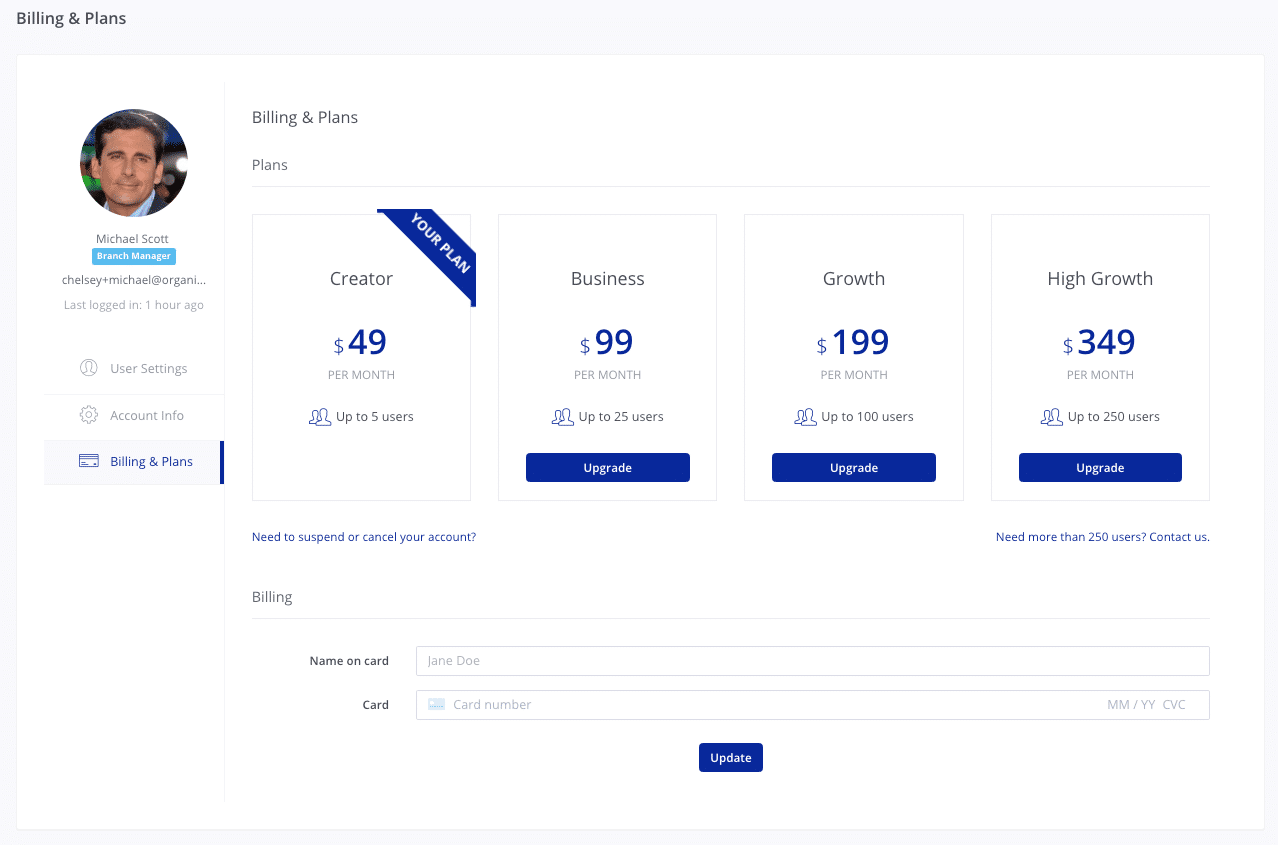 - Billing Admins can edit plans (and upgrade your account!) in settings