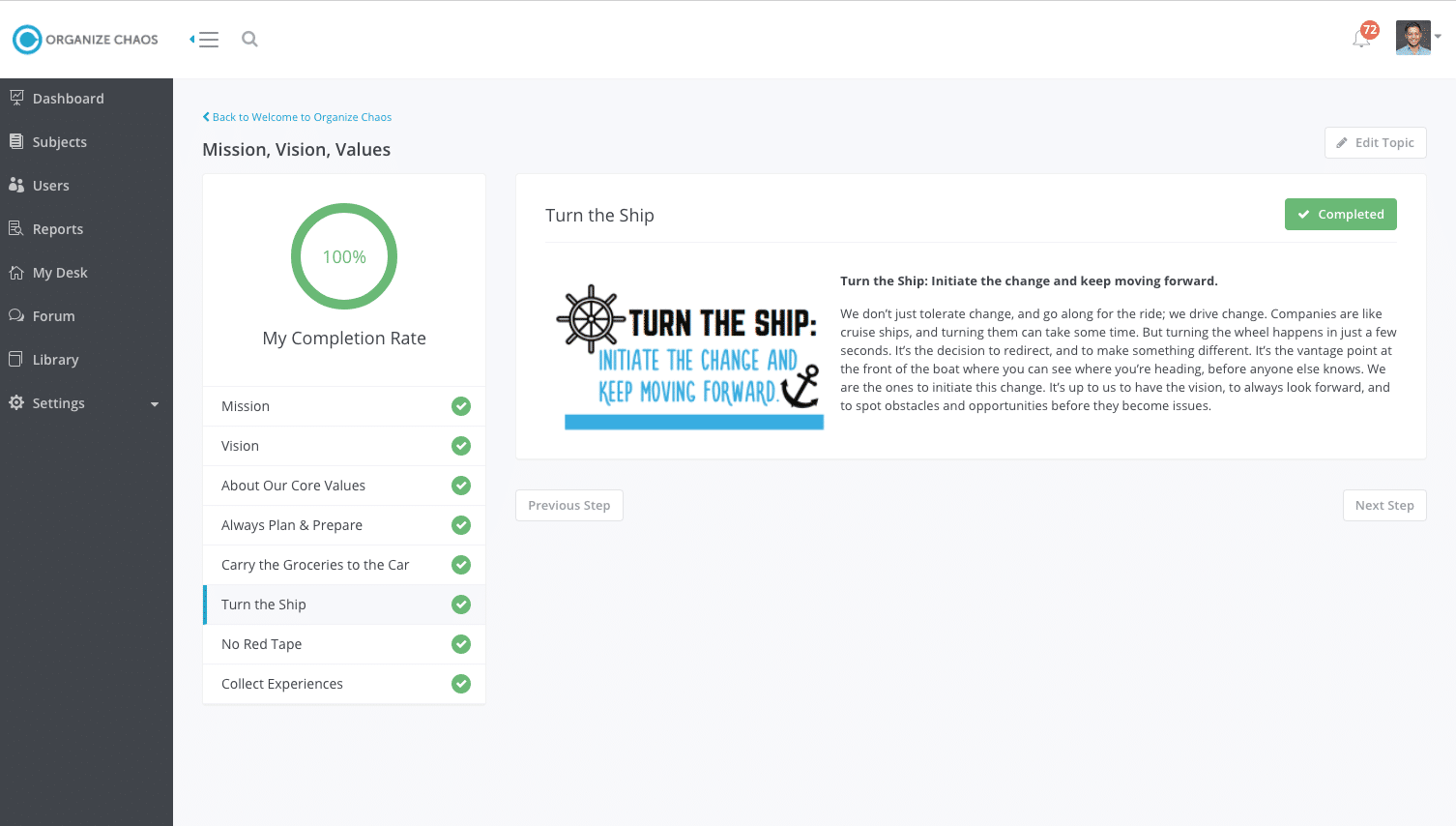 Within Trainual, you can make separate steps for your mission, your vision, and your core values and build out the content that everybody on your team should know. Add photos for examples or even videos of yourself or your team talking about the pieces of your MVV and what they mean in relation to their roles, responsibilities, or relationships with colleagues and clients.