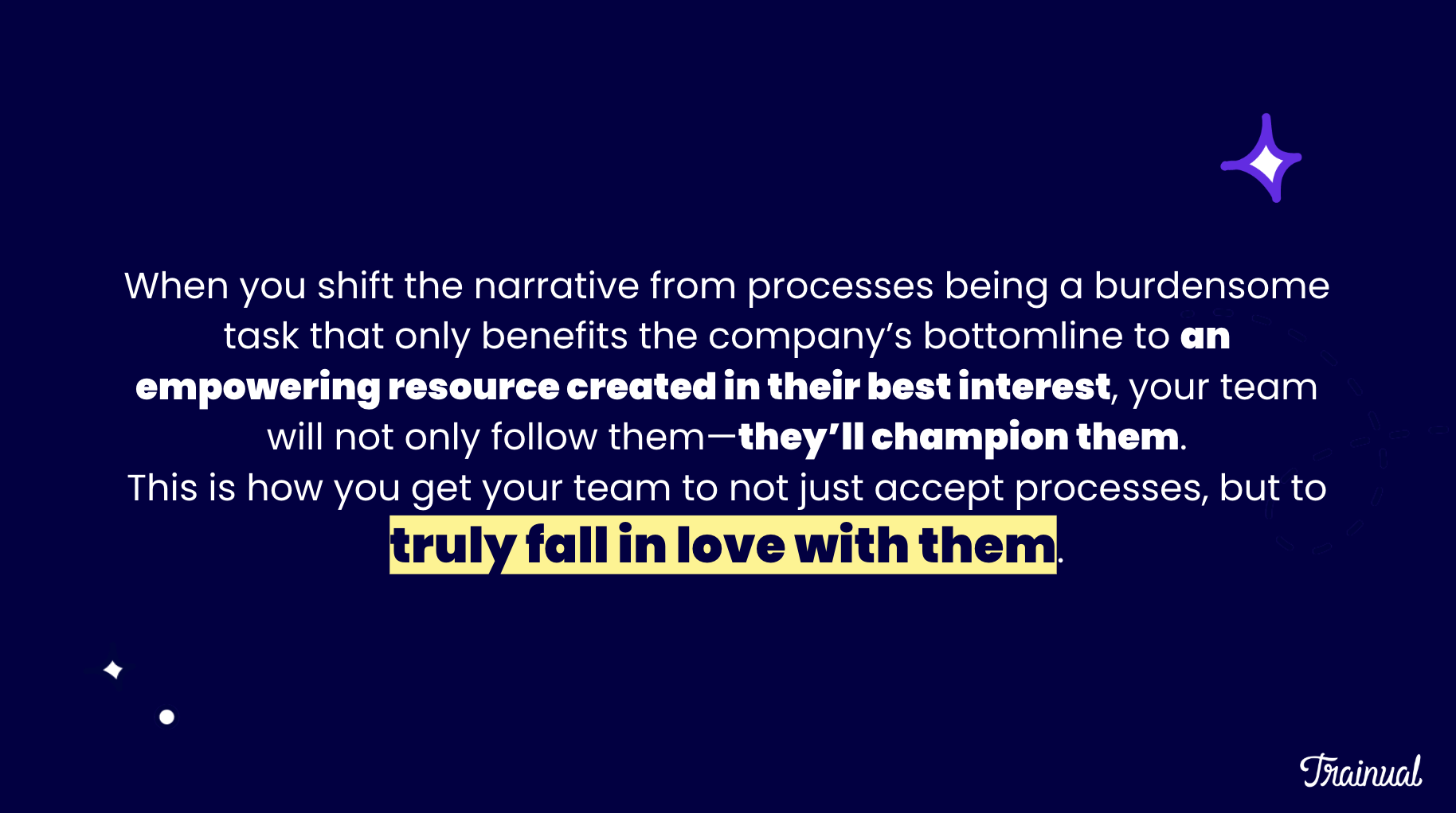 When you shift the narrative from processes being a burdensome task that only benefits the company’s bottomline to an empowering resource created in their best interest, your team will not only follow them — they’ll champion them. This is how you get your team not just to accept processes but truly fall in love with them.