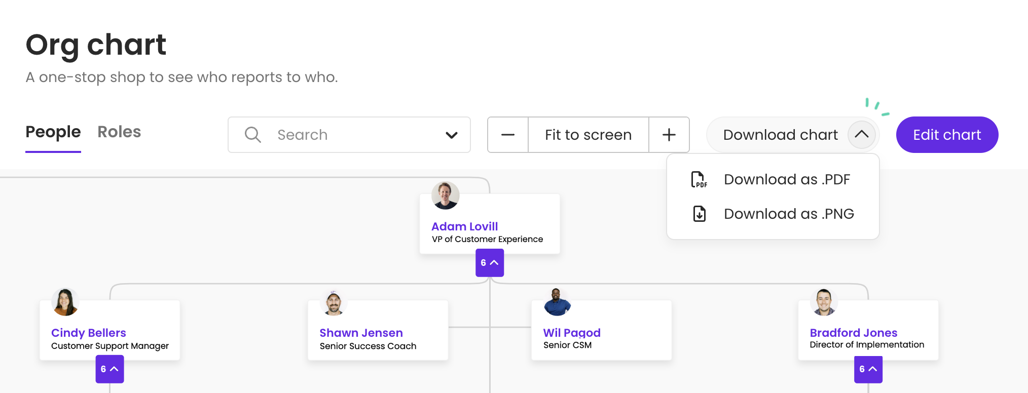 But you might want your chart to be available outside of Trainual. Maybe to post a hard copy up in the office for quick reference, add it to a presentation deck, or email it to someone outside of your organization. Now that’s possible with org chart exporting! Just click “Download chart” on the org chart page to save the file to your computer in PDF or PNG format.
