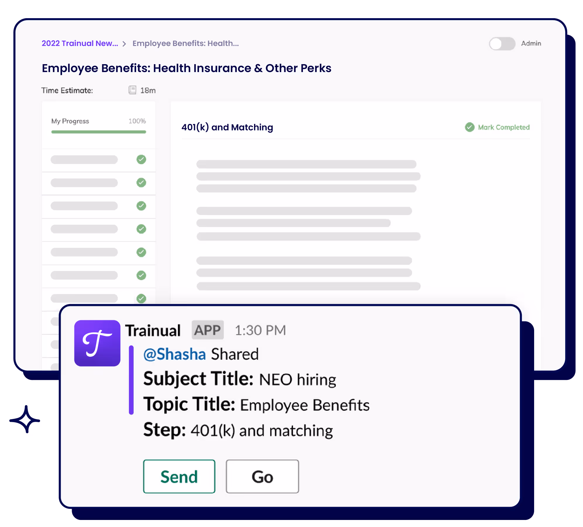 Trainual keeps your team aligned and accountable from anywhere β including Slack. If someone has questions about your policies or procedures, Slack them the training in just a few clicks.